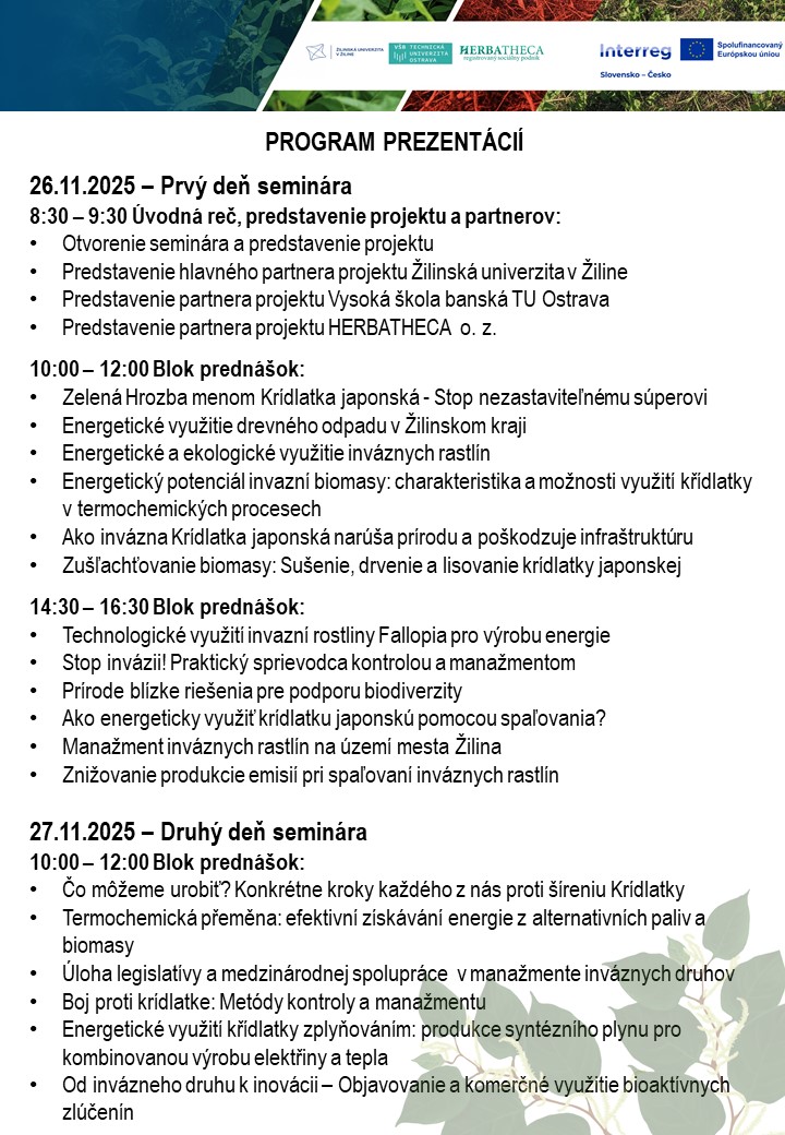 Počas seminára odborníci zo Žilinskej univerzity v Žiline, Vysokej školy banskej – TU Ostrava a HERBATHECA o. z. predstavia výsledky výskumu a skúsenosti z praxe v rámci projektu Interreg SK–CZ – Podpora biodiverzity eradikáciou inváznych rastlín s energetickým využitím (ITMS NFP403201DXT7). Súčasťou programu budú prednášky zamerané na identifikáciu a vplyv inváznych rastlín, možnosti ich efektívneho odstraňovania, technologické spracovanie biomasy a jej využitie ako obnoviteľného zdroja energie.